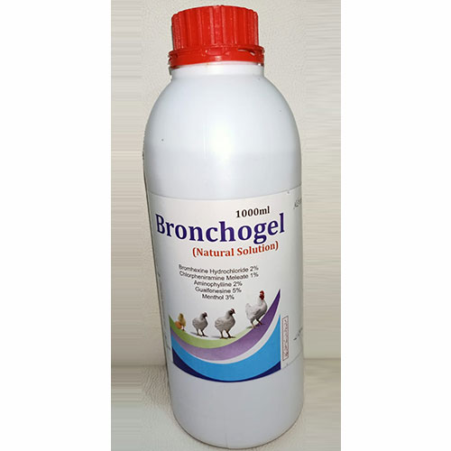 Bronchogel is indicated for the prevention and supportive treatment of respiratory tract infections in poultry such as CRD, bronchial infections, laryngotracheitis, in uenza, pneumonia, bronchopneumonia, rhinitis where mucus is a complicating factor causing respiratory symptoms such as dyspnea, cough and sneezing. It is a powerful mucolytic, expectorant and a respiratory antiseptic agent. It relaxes the smooth muscles removes the congestion, enhances the expectoration, dries the post nasal drip, increases the bronchial dilation and takes care of any possible allergy.