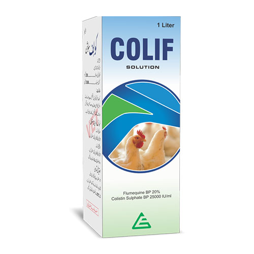 Colif Solution is indicated for the treatment of infectious diseases caused by micro organisms susceptible to Flumequine and Colistin, such as bacterial diarrhea, enteritis, urinary tract infections, mastitis, Pneumonia and multiple arthritis.
