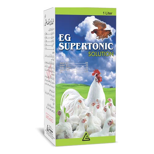 EG Supertonic Solution has vital role to enhance the immunity level. EG Supertonic Solution controls free radicals in the body due to its antioxidant effect. EG Supertonic Solution increases food intake which results in better production. EG Supertonic Solution is very effective in cases of hepatomegaly. EG Supertonic Solution is very useful for the proper liver functions after antibiotic therapy. EG Supertonic Solution is very useful for the regeneration of the damaged liver cells. EG Supertonic Solution is very effective in the treatment of inflammation of pericardium. EG Supertonic Solution prevents fibrosis formation in liver, lungs, kidneys and pancreas. EG Supertonic Solution is very helpful for the excretion of toxins from the body. EG Supertonic Solution controls sudden death in broilers. EG Supertonic Solution is very useful in livestock after deworming, indigestion and antibiotic administration.