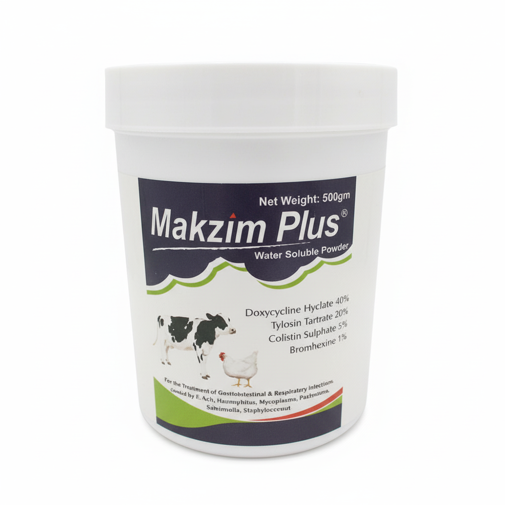 Makzim plus powder is used for control and treatment of Coryza, CRD, CCRD, ORT, E-Coli and other bacterial causing respiratory diseases.