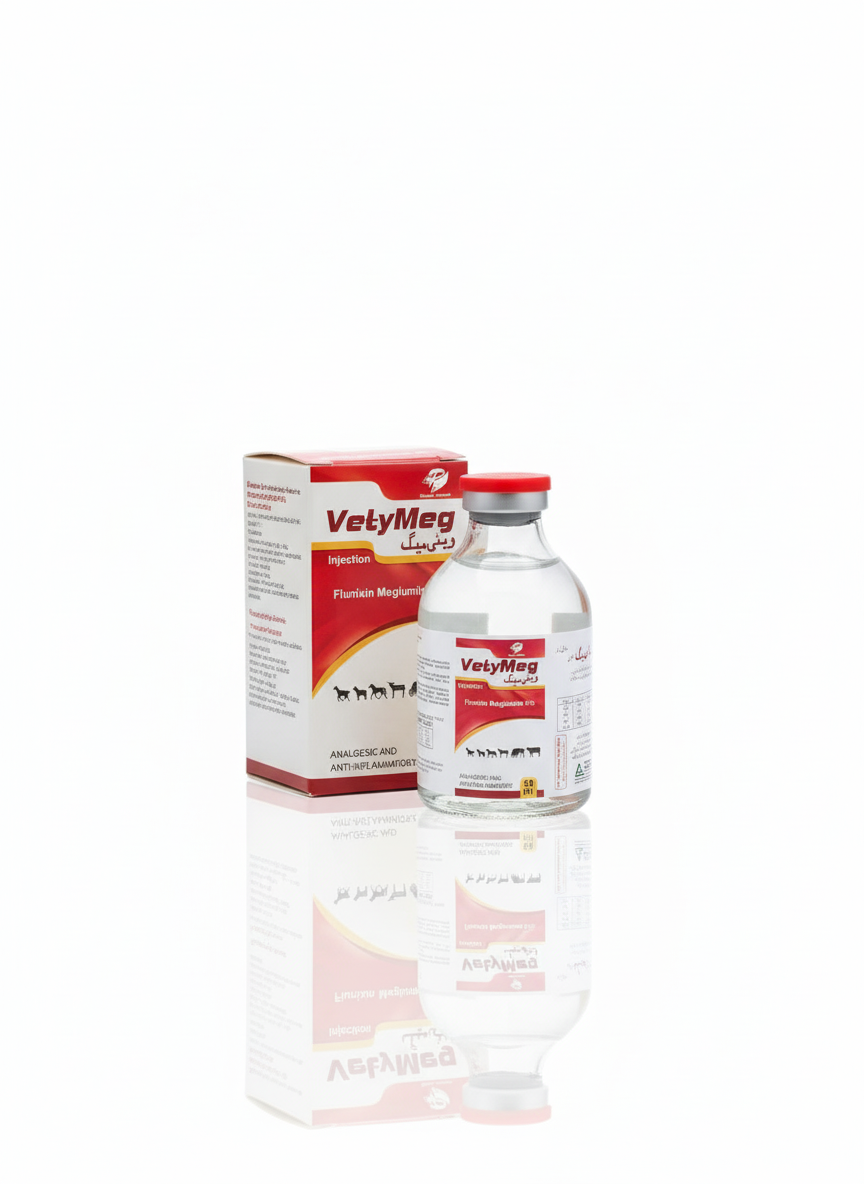 For the treatment of musculoskeletal condition, inflammation and painful conditions such as arthritis, laminitis, tendolitis and myoslitis in horses, cattle and dogs. Vetymeg is a relatively potent, non-narcotic, non-steroidal analgesic with anti-inflammatory, anti-endotoxic and anti -pyretic properties. Vetymeg is especially indicated for the treatment of respiratory diseases and acute mastitis.